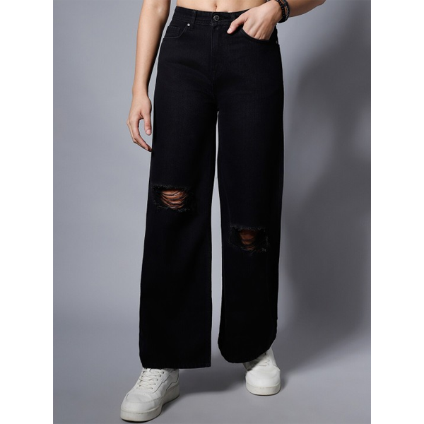 Women Black Wide Leg High-Rise Slash Knee Jeans